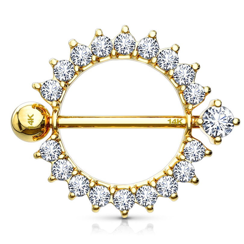 Ontbreekt het je nog aan een exclusief tepelsieraad voor je tepelpiercing? Dan heb je nu de mogelijkheid om je tepel met een sieraad gemaakt van echt 14 karaats goud te bedekken. Compleet met transparante, mooie steentjes lange de rand. Het sieraad heeft het design van een kleine zon, en deze vele kleine steentjes glitteren en glimmeren prachtig. Iedere individuele steen is apart ingelegd en zijn dus op zich zelf vast in het sieraad.