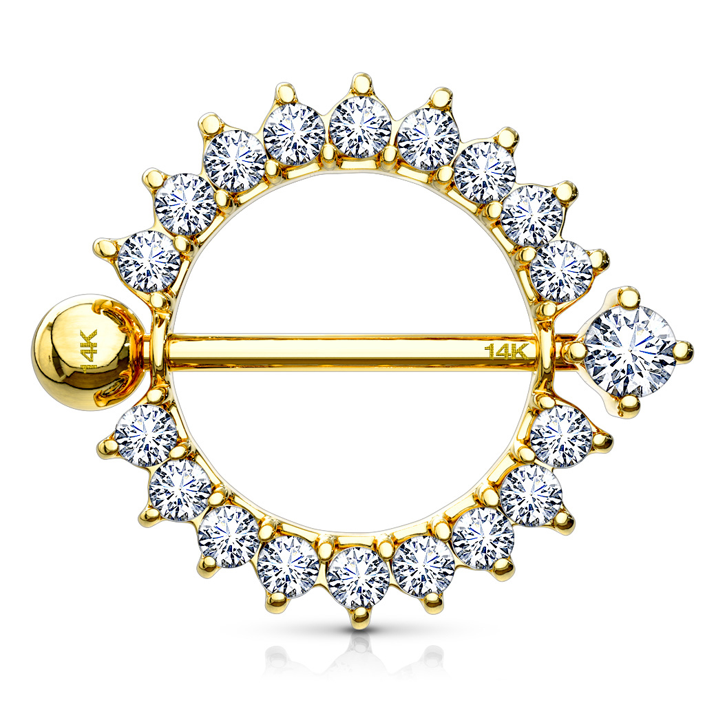 Ontbreekt het je nog aan een exclusief tepelsieraad voor je tepelpiercing? Dan heb je nu de mogelijkheid om je tepel met een sieraad gemaakt van echt 14 karaats goud te bedekken. Compleet met transparante, mooie steentjes lange de rand. Het sieraad heeft het design van een kleine zon, en deze vele kleine steentjes glitteren en glimmeren prachtig. Iedere individuele steen is apart ingelegd en zijn dus op zich zelf vast in het sieraad.