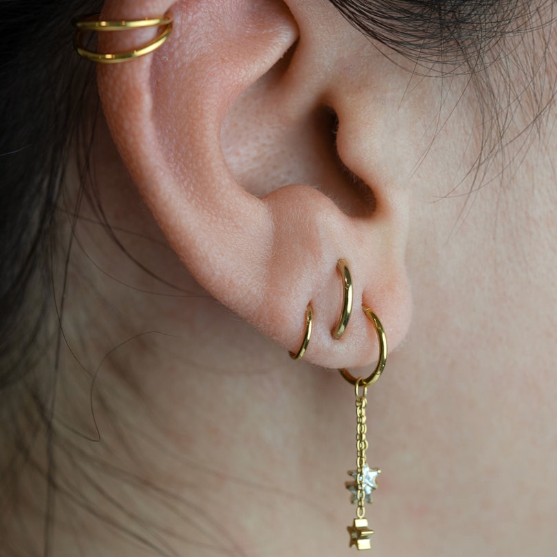 Drie sterren, drie kettinkjes, veel stijl. Dit bedeltje met een trio sterren in titanium geeft lekkere beweging en wat persoonlijkheid aan je sieradenstack. Drie kettinkjes hangen aan één oogje, elk met een helder steentje in een bezelzetting dat precies goed meewaait.