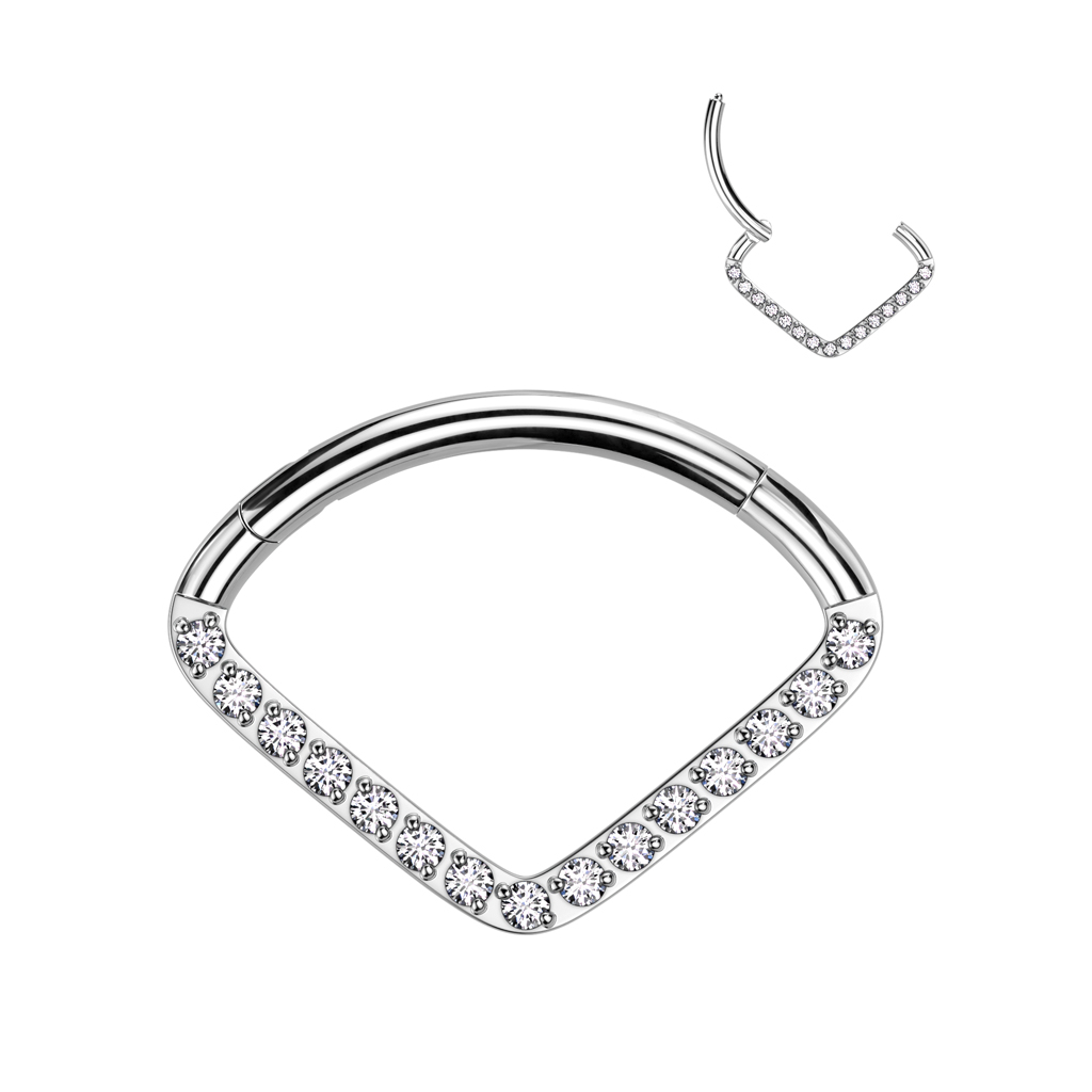 Ga jij altijd voor de glitter en de glamour? Stop met scrollen! Deze tijdloze ring heeft een chevron design dat is bezaaid met sierlijke steentjes (het stukje dat in je piercing gaat is uiteraard glad voor ultiem comfort). Dit sieraad heeft de perfecte hoeveelheid glamour en is een gegarandeerde blikvanger. Het scharniertje opent en sluit super makkelijk, dus je kan 'm zo indoen als je klaar bent om te shinen.
