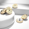 Het deel van het sieraad dat in de dermal anchor base gaat en in contact staat met de huid, is gemaakt van chirurgisch staal. Het patroon is gemaakt van messing en is bedekt met een goudkleurig deklaagje, waardoor het op een echt patroon lijkt. Het sieraad meet ca 7 mm - daardoor is er dan ook genoeg plek voor de ingegraveerde tekst die je op de afbeelding hierboven kunt zien.