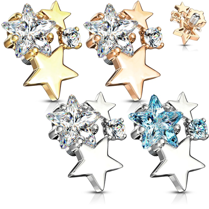 Met dit sieraad krijg je twee glanzende metalen sterren, één ster uit steen, en nog eens een helder klein sterretje aan de zijkant. Er is dus veel bekijks op deze dermal! De sterren zijn gemaakt uit messing en daarna gecoat met een kleur naar keuze. De schroef aan de achterkant is daarentegen uit chirurgisch staal vervaardigd.
