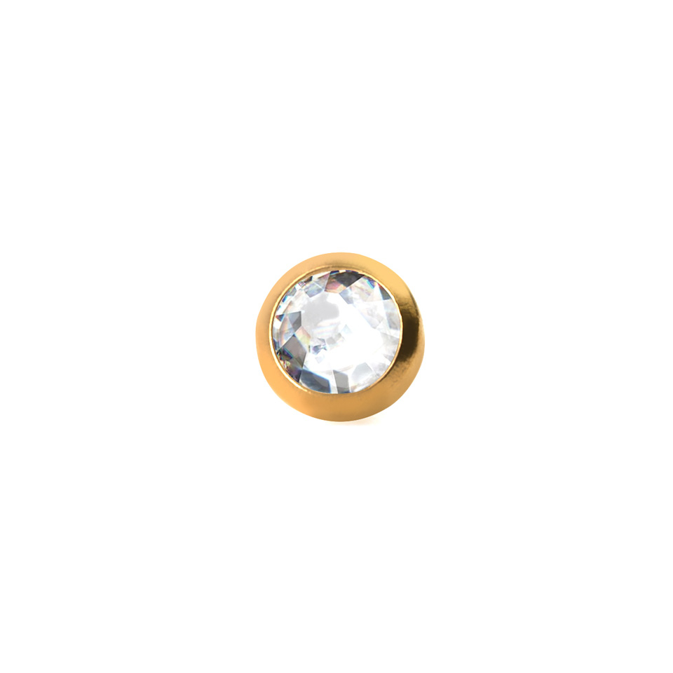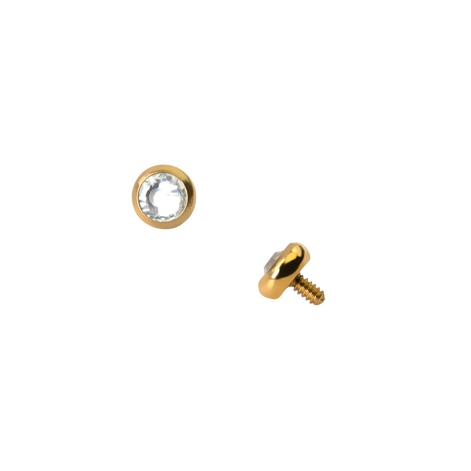 Dit piercingssieraad voor een dermal anchor bestaat uit een klein, rond schijfje, waar een mooie, transparante steen in zit.