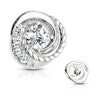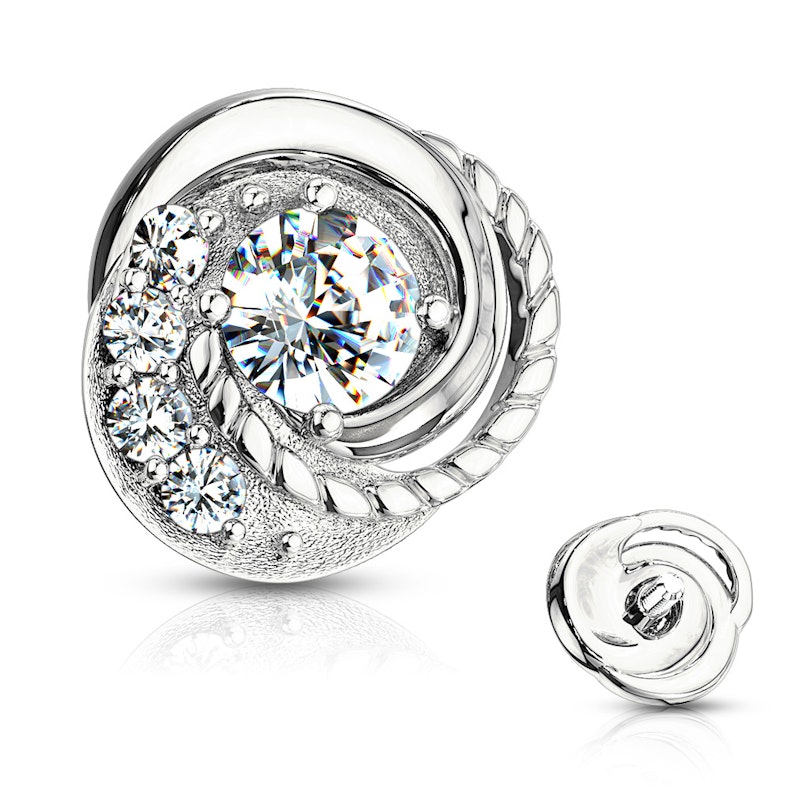 Dit dermal is een erg interessant exemplaar. Door zijn opvallend ontwerp onderscheidt het zich van andere juwelen. De ene zijkant werd met een mooi gevlochten patroon versierd, welke aan de buitenkant begint en in het midden eindigt. De andere kant is dan weer voorzien van een rij transparante steentjes. Om het plaatje helemaal af te maken, werd er in het midden van het sieraad een mooie grote transparante steen geplaatst.