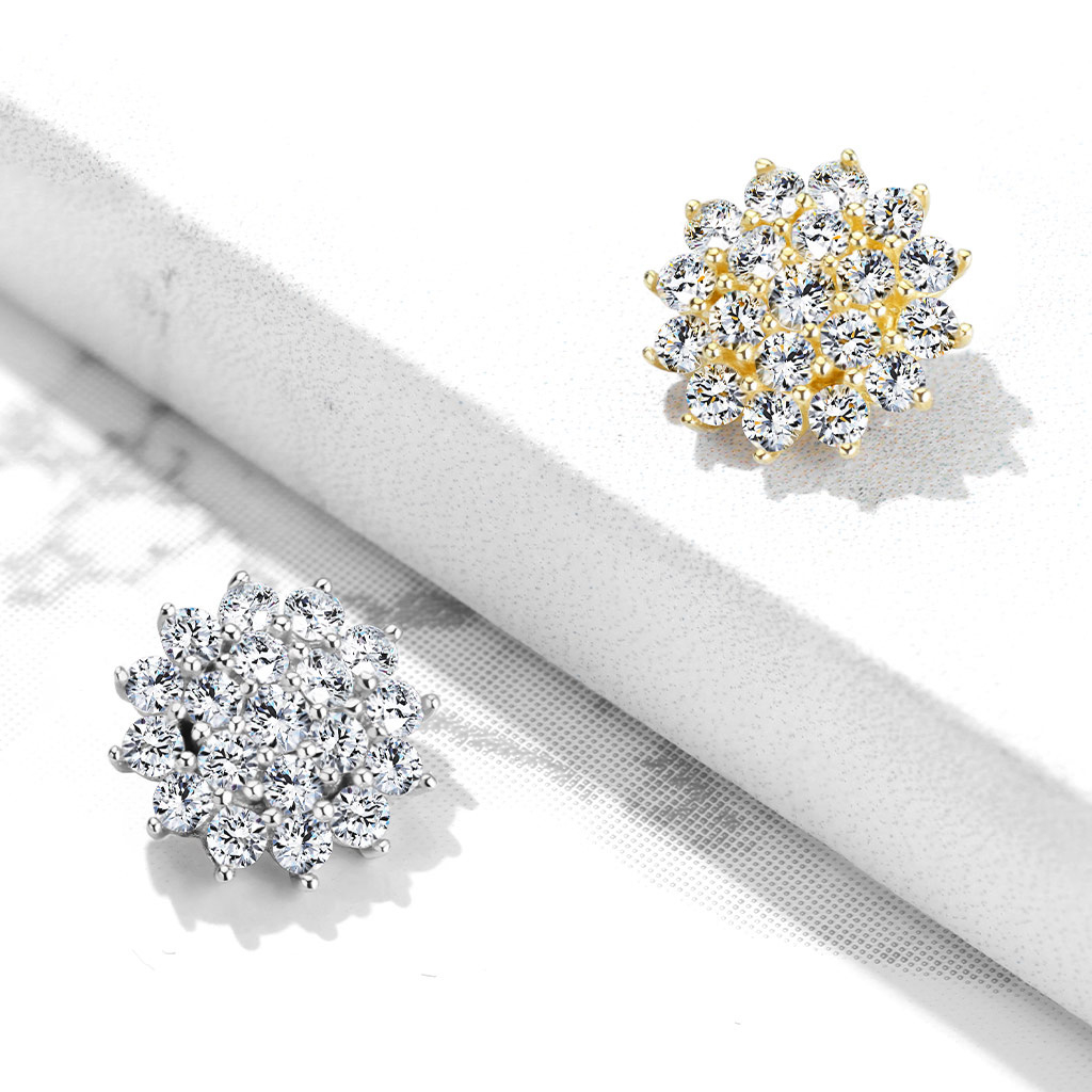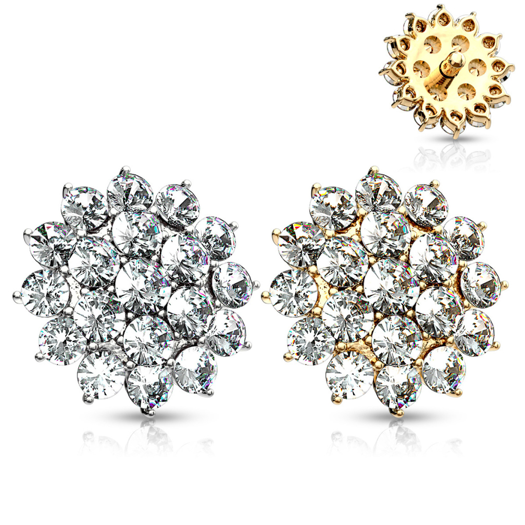 Hier vind je een sieraad dat zeker weten je dermal base zal bekleden op zo'n manier dat het prachtig zal schitteren. Deze dermal is gevormd als een bloem en heeft een hele hoop kleine transparante steentjes die het sieraad zijn gloed geeft. De steentjes zitten vast met behulp van piep kleine vangarmpjes die opsteken en iedere steen vast houden - zo blijven de steentjes goed op hun plek zitten.