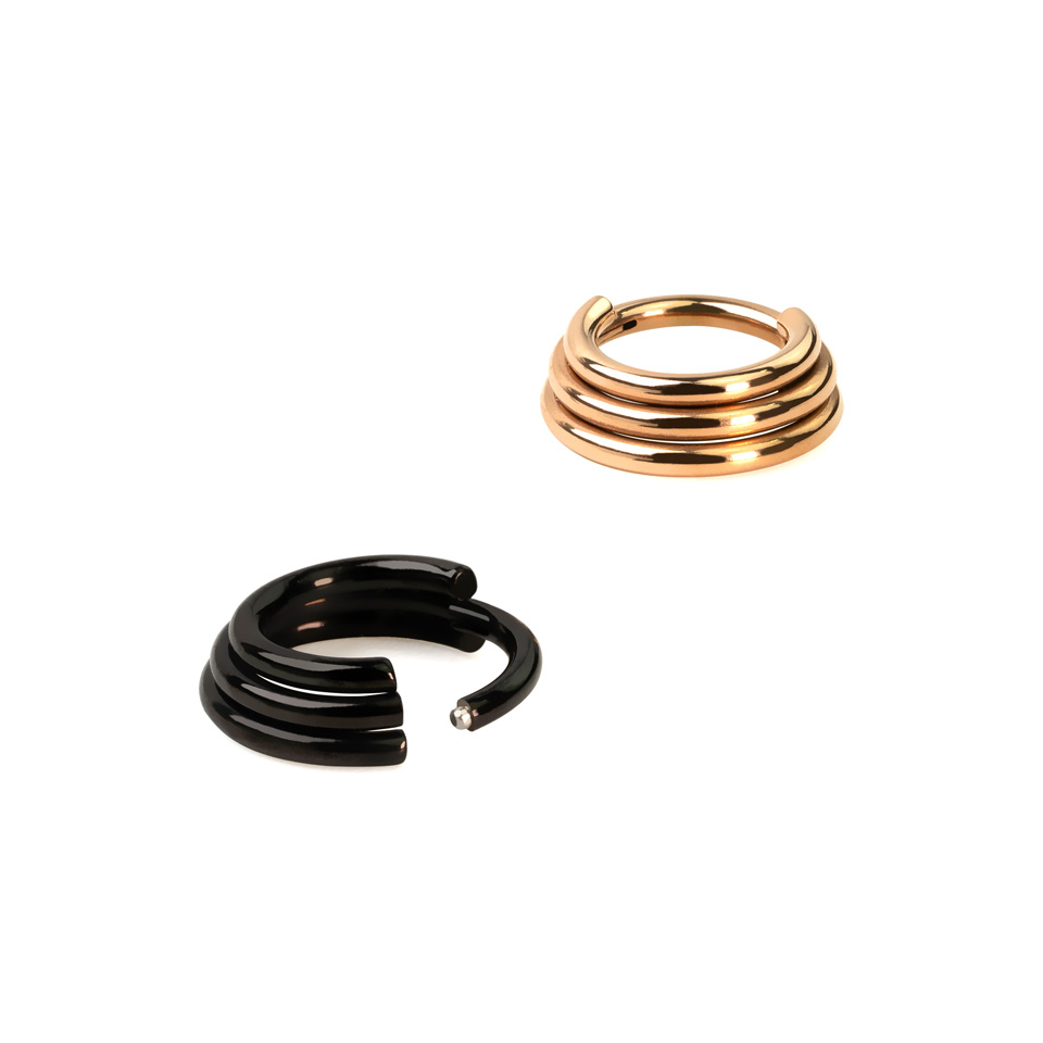Deze eenvoudige maar toch doeltreffende trio heeft mijn hart veroverd. Het ziet er echt uit als drie afzonderlijke ringen, en dat met slechts één oorlel! Te combineren met elke andere sieraden. Door de bijzondere vorm passen de ringen mooi op de oorlel. Lieve Bodymod-team, graag ook in titanium!0