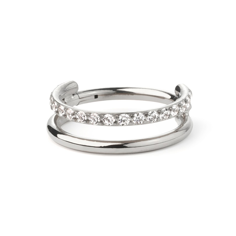 Dit unieke sieraad geeft de illusie dat je twee ringen draagt: een met een rij kleine steentjes en een zonder. De twee ringen zijn samengevoegd zodat je maar ƩƩn piercing nodig hebt. Het sieraad is gemaakt van titanium, is hypoallergeen en erg duurzaam. De prachtige ring is verkrijgbaar in verschillende diameters en je kan kiezen tussen goud en zilver. Deze ring is geschikt voor diverse oorpiercings en zal een betoverende toevoeging zijn aan je oor, in welke piercing je 'm ook draagt.