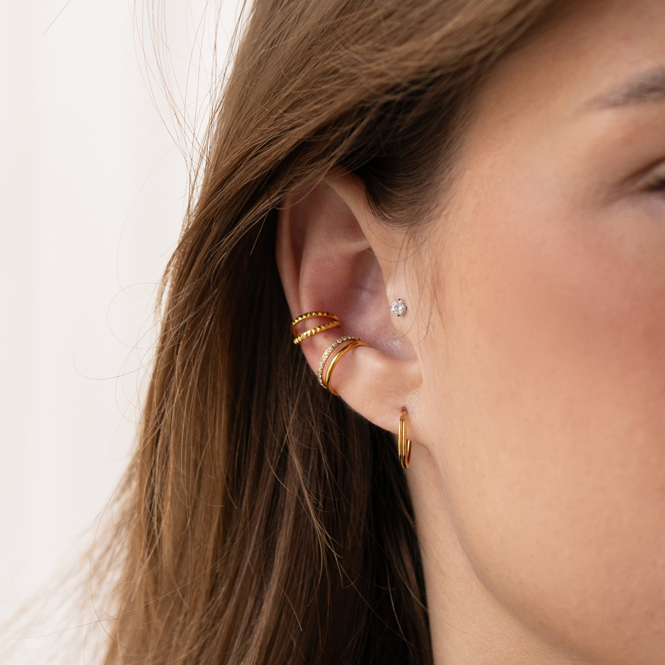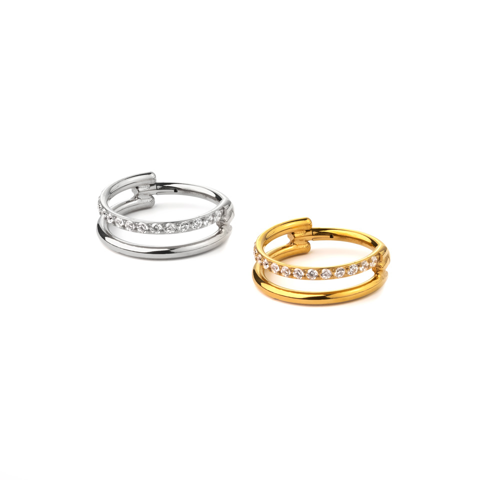 Dit unieke sieraad geeft de illusie dat je twee ringen draagt: een met een rij kleine steentjes en een zonder. De twee ringen zijn samengevoegd zodat je maar ƩƩn piercing nodig hebt. Het sieraad is gemaakt van titanium, is hypoallergeen en erg duurzaam. De prachtige ring is verkrijgbaar in verschillende diameters en je kan kiezen tussen goud en zilver. Deze ring is geschikt voor diverse oorpiercings en zal een betoverende toevoeging zijn aan je oor, in welke piercing je 'm ook draagt.