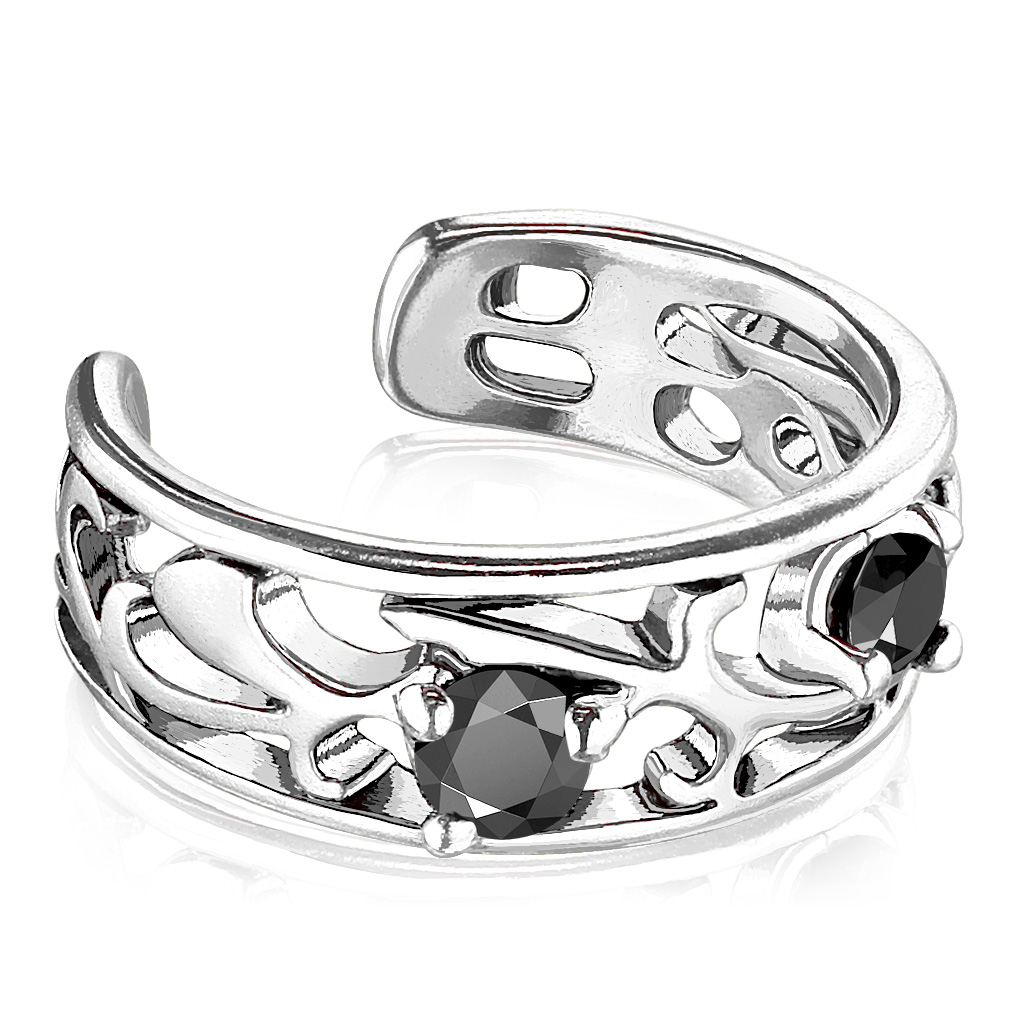 Deze earcuff heeft een prachtig filigraan patroon, geĆÆnspireerd door de natuur, met lijntjes die takken voorstellen. Het sieraad heeft twee kleine zwarte steentjes, waardoor er een interessante asymmetrische compositie ontstaat.
