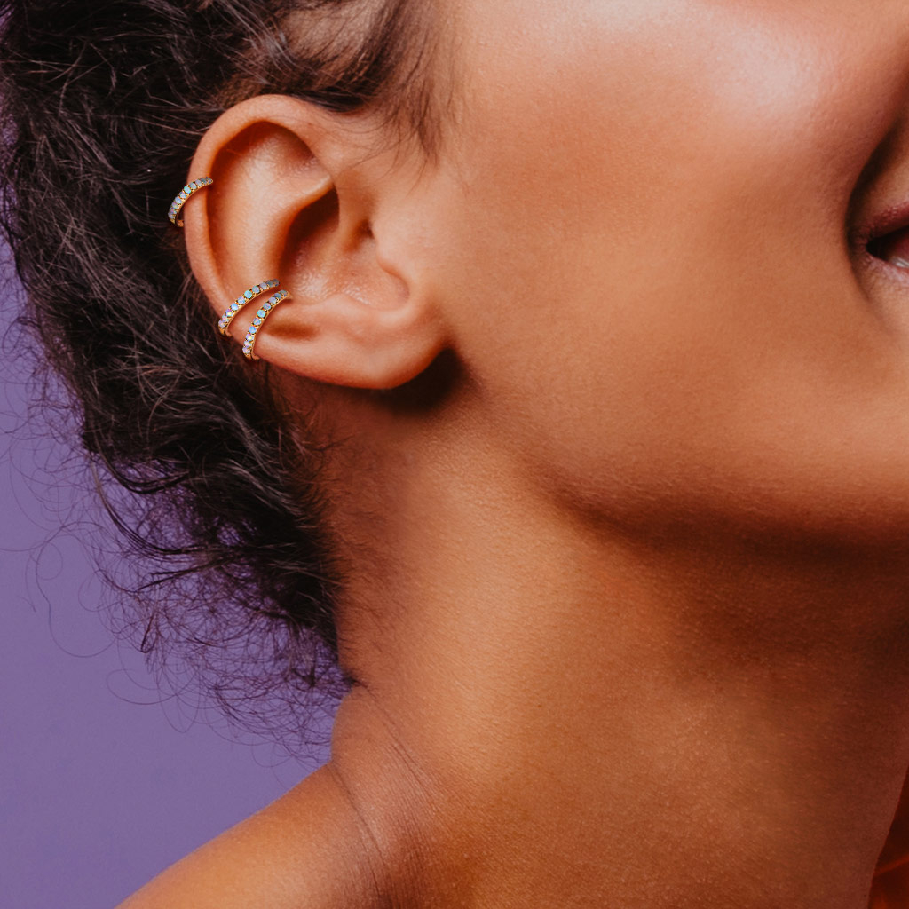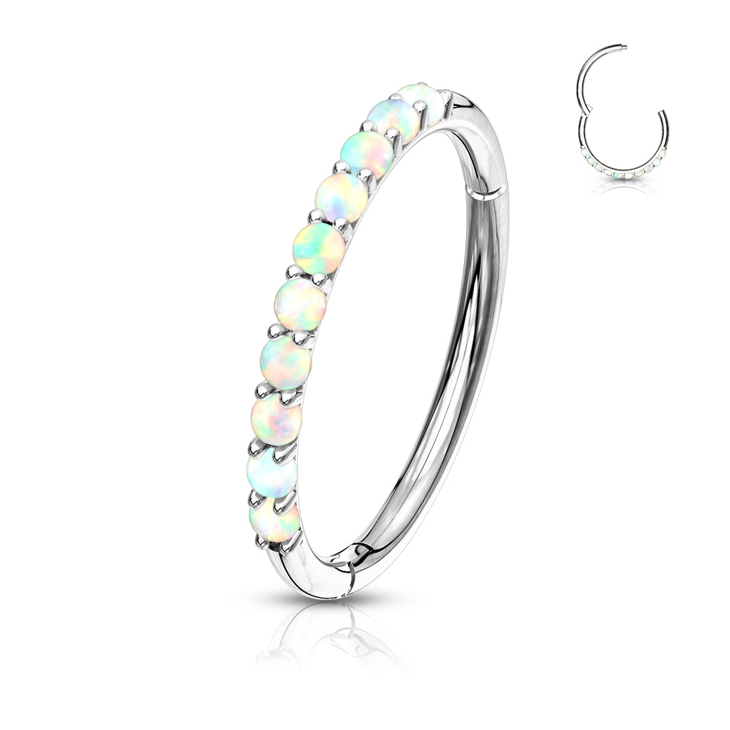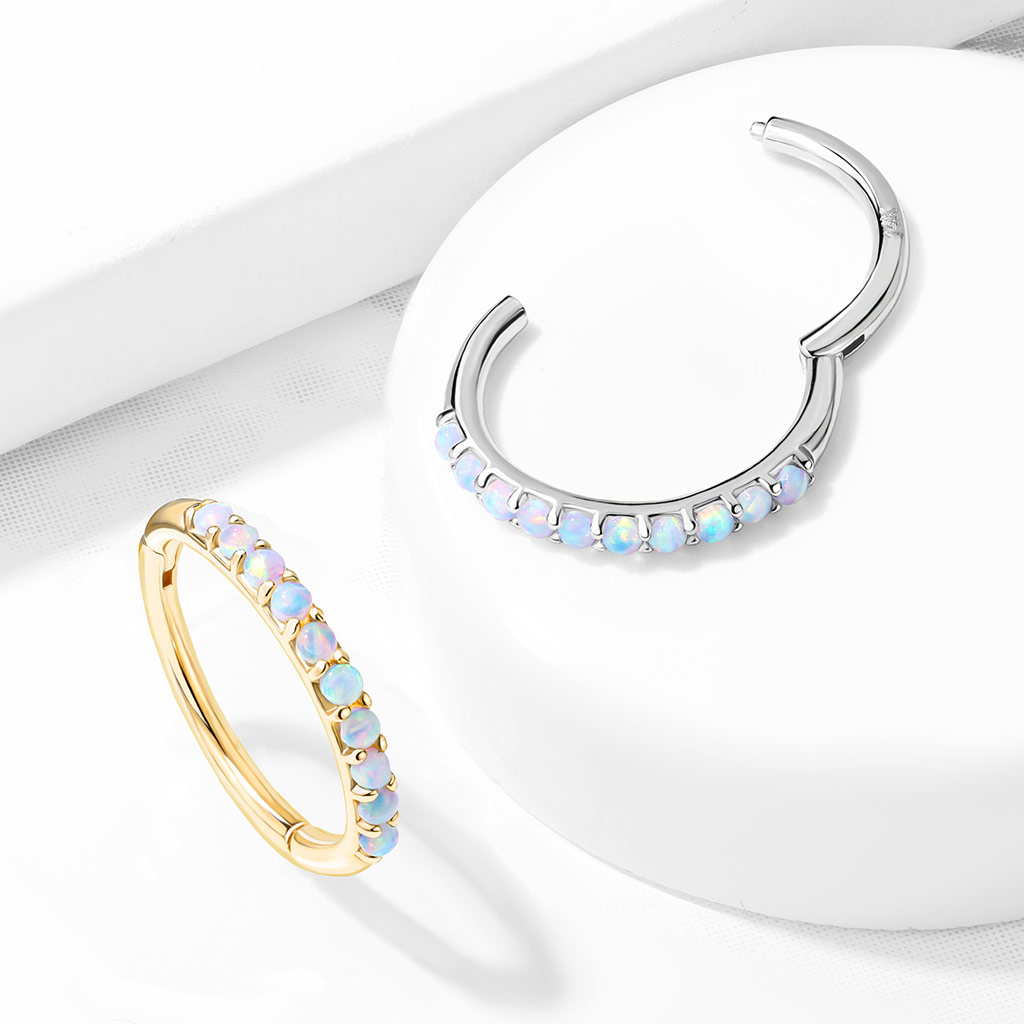De ring presteert goed in zowel oorpiercings als neuspiercings. Misschien niet in een septum omdat de opalen dan naar beneden wijzen. De opalen zijn overigens geen echte opalen omdat deze te kwetsbaar zijn voor het gebruik in sieraden. In plaats daarvan zijn synthetische opalen gebruikt, die veel veerkrachtiger zijn - hier kan alleen een expert het verschil zien.