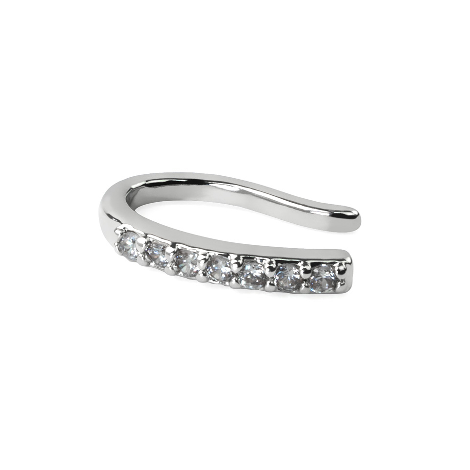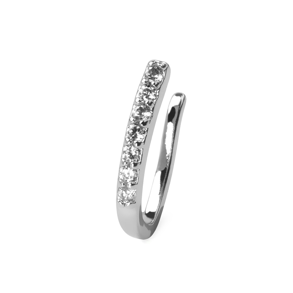De dikte van het sieraad is ongeveer 1 mm, en heeft, zoals je kunt zien op de afbeelding, een rijtje met zeven transparante steentjes. Aangezien het een fake piercing sieraad is, waarvoor je geen gaatje in het lichaam nodig hebt, is het hele sieraad gemaakt van messing en heeft het een glanzend laagje gekregen om het sieraad zijn glanzende oppervlak te geven.