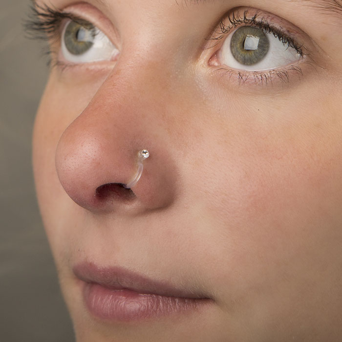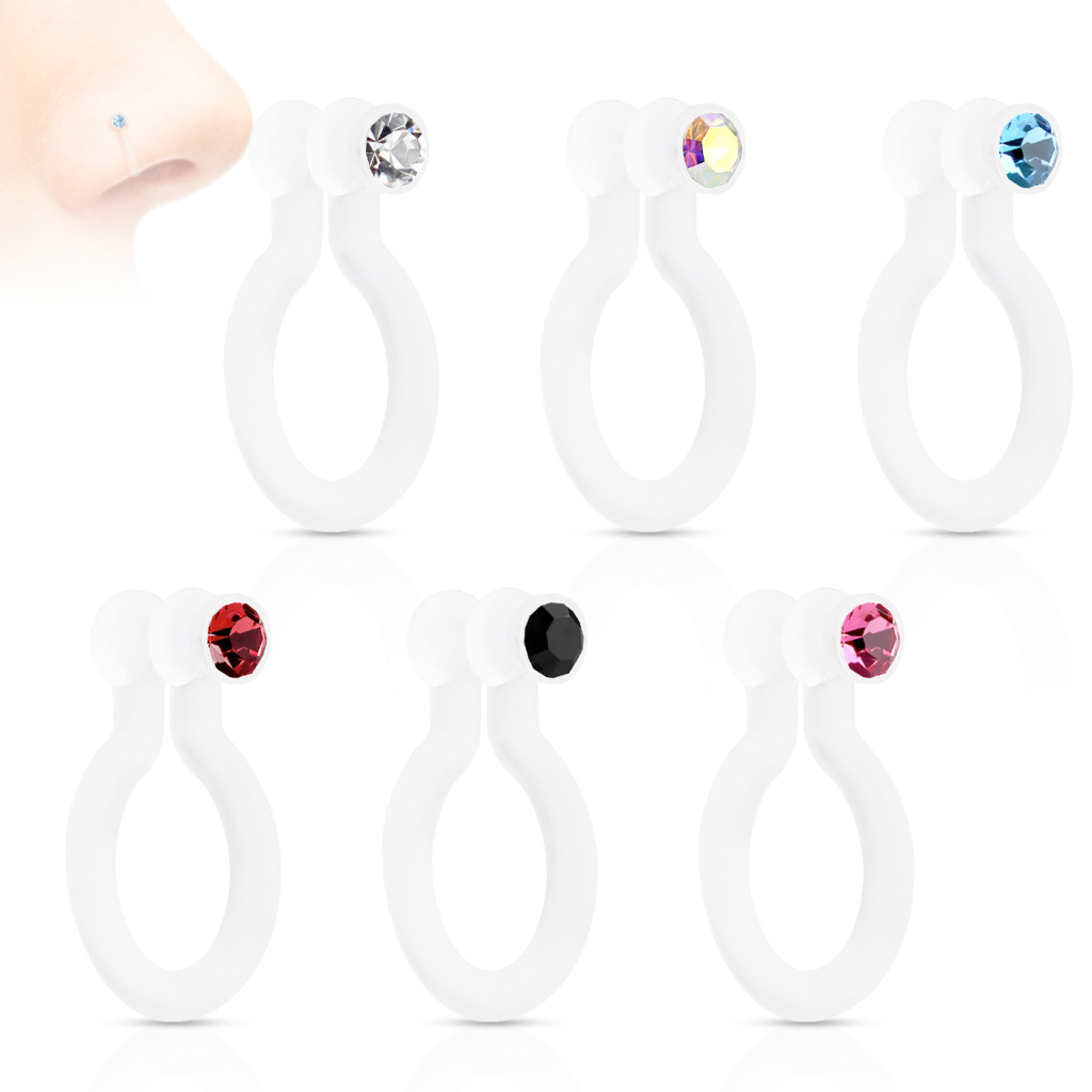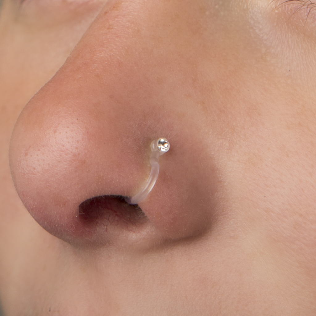 Aan de buitenkant is deze fake neuspiercing van een klein steentje voorzien, dat beschikbaar is in veel verschillende kleuren, en aan de binnenkant eindigt het sieraad met een vlak schijfje dat tegen de binnenkant van de neusvleugel drukt, zonder pijn te doen.