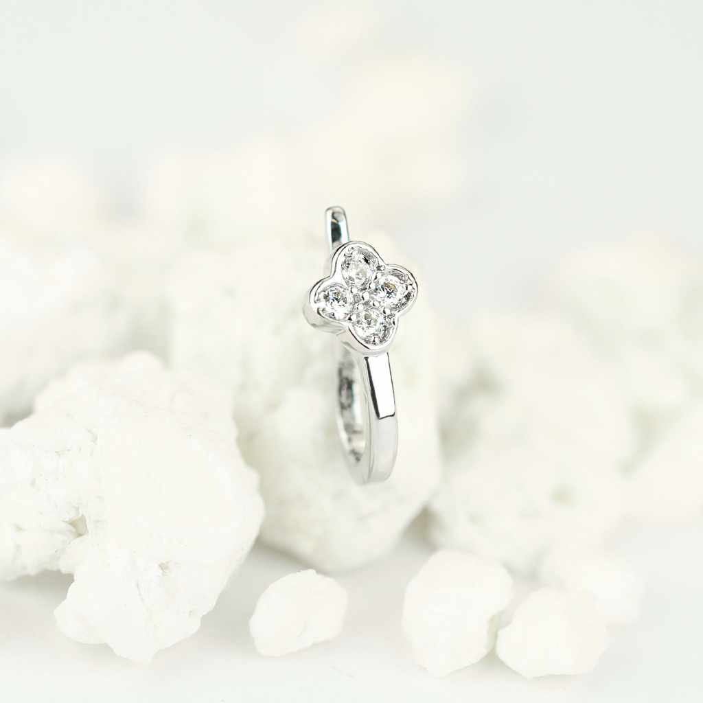Als je een klavertje vier vindt, dan brengt dat geluk in je leven. Nu hoef je niet langer te zoeken, want je kunt het gewoon krijgen door deze fake neuspiercing te kopen. Ja, je hoeft niet eens een gaatje in je neus te hebben, je hebt alleen maar een neus nodig. Het sieraad bestaat in al zijn eenvoud uit een stuk messing in de vorm van een U. Het sieraad heeft een glanzend laagje gekregen voor een glanzend oppervlak. Op de voorkant, het deel dat dan aan de buitenkant van je neus komt te zitten, zit zoals gezegd, het klavertje vier. Ieder blaadje van het klavertje bestaat uit een transparant steentje. Het klavertje meet ongeveer 4,5 mm in diameter.