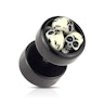 Hier hebben we een mooie fake plug gemaakt van acryl met een 1,2 mm dikke staaf die gemaakt is van chirurgisch staal, wat de standaardmaat voor oorgaatjes die gestoken zijn met een piercingnaald is. De plug is werkelijk natuurgetrouw nagemaakt en is erg bijzonder door de 3D doodskop op de voorkant.