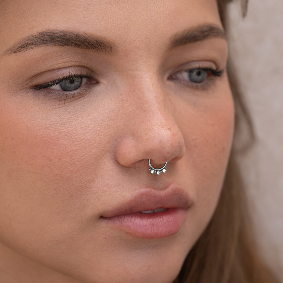 Het sieraad heeft drie transparante CZ steentjes, die van elkaar gescheiden zijn door kleine kraaltjes. De steentjes zijn 2 mm en de kraaltjes 1 mm. De diameter van de onderkant van het sieraad is 8 mm. De septumring is beschikbaar in drie kleuren: zwart, zilver en goud. Kies je favoriet en ga voor een nieuwe look!