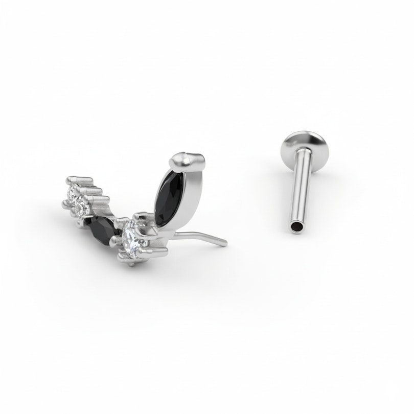Deze gebogen labret met zwarte en doorzichtige stenen staat helemaal in het teken van ritme en contrast. Vier stenen met pootjes gezet, afwisselend zwart en doorzichtig, volgen een soepele boog die opvalt zonder te smeken om aandacht.