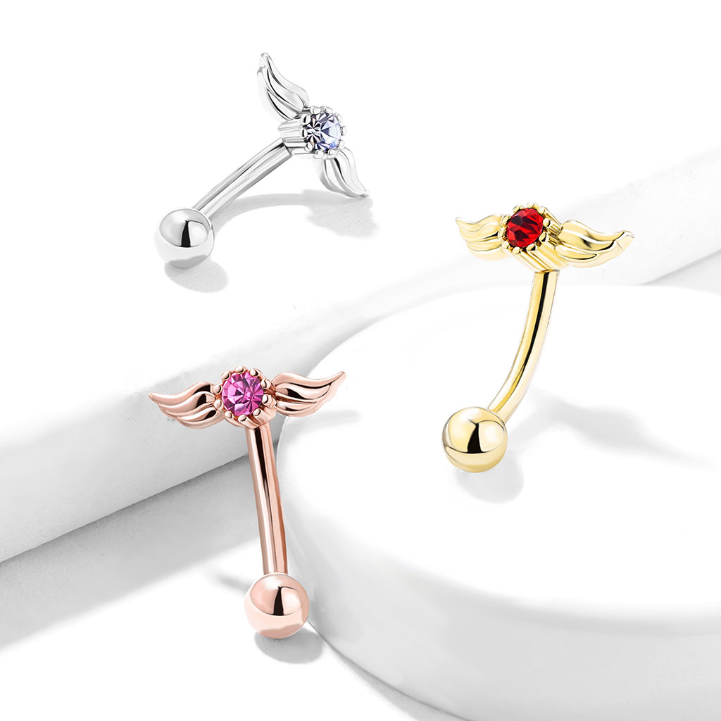De staaf op de afbeelding is een gebogen staaf en is dan ook heel geschikt voor een wenkbrauw. De staaf is 8 mm lang en 1,2 mm dik. Aan de onderkant van de staaf zit een 3 mm balletje dat je op en af kunt schroeven. Aan de top van de staaf zit geen balletje want in plaats daarvan zit er een paar uitgestrekte engelenvleugels. In het midden van de vleugels zit een mooie steen die verkrijgbaar is in verschillende kleuren.
