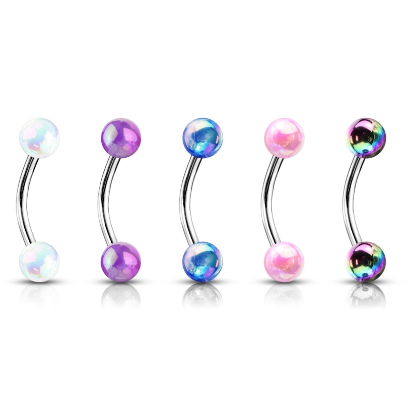 Zoals je kunt zien op de productafbeelding hierboven, is deze gebogen staaf verkrijgbaar in verschillende uitgaven. Je kunt namelijk zelf de kleur voor de twee balletjes op dit sieraad kiezen - waaronder lila en blauw. Je ontvangt echter niet alleen de hoofdkleur (die je zelf gekozen hebt natuurlijk), maar ook een scala aan aangrenzende kleuren op het pallet. Als je bijvoorbeeld kiest voor de roze variant van dit sieraad, dan ontvang je waarschijnlijk ook kleuren als rood, wit en andere aangrenzende kleuren van roze op de balletjes. Verder is er ook nog de mogelijkheid om tussen verschillende lengtes voor dit staafje te kiezen.