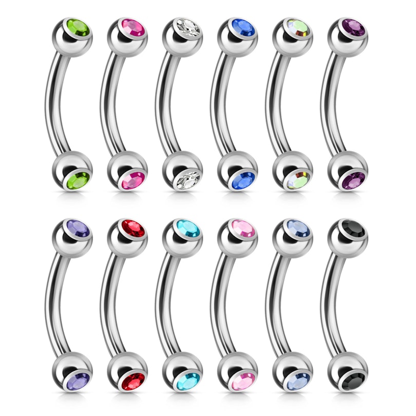 De twee balletjes aan de uiteinden hebben elk een diameter van 3 mm en daarmee een goede maat om het sieraad te gebruiken in bijv. een wenkbrauwpiercing. De balletjes zijn versierd met een mooi steentje dat je in verschillende kleuren kan krijgen.