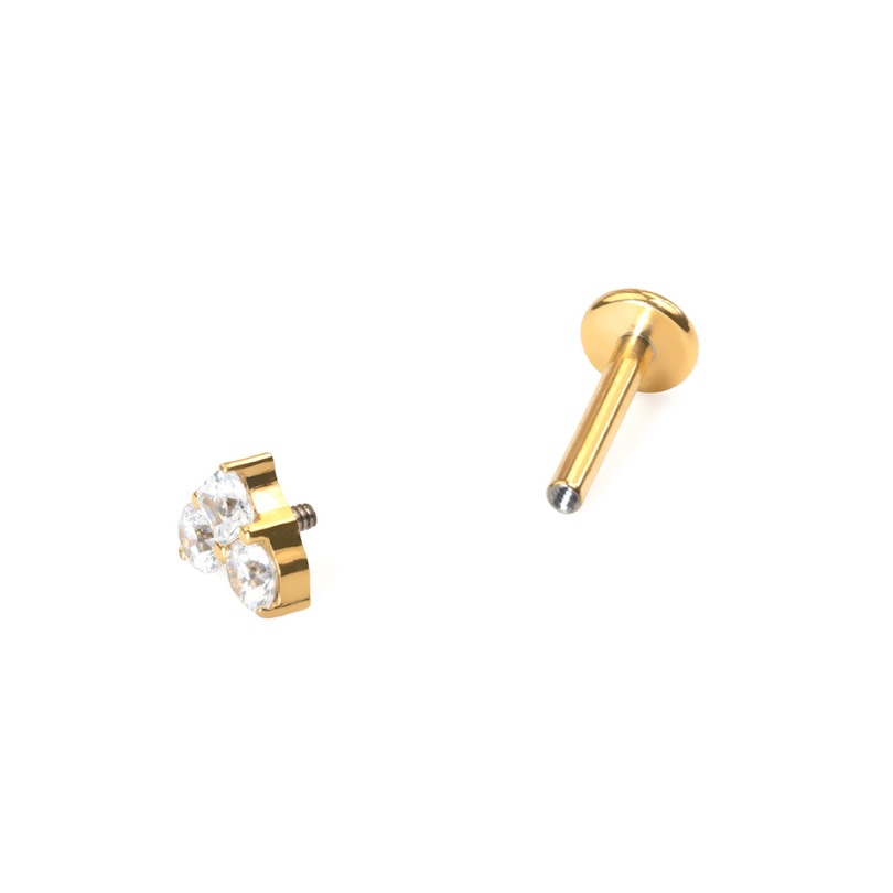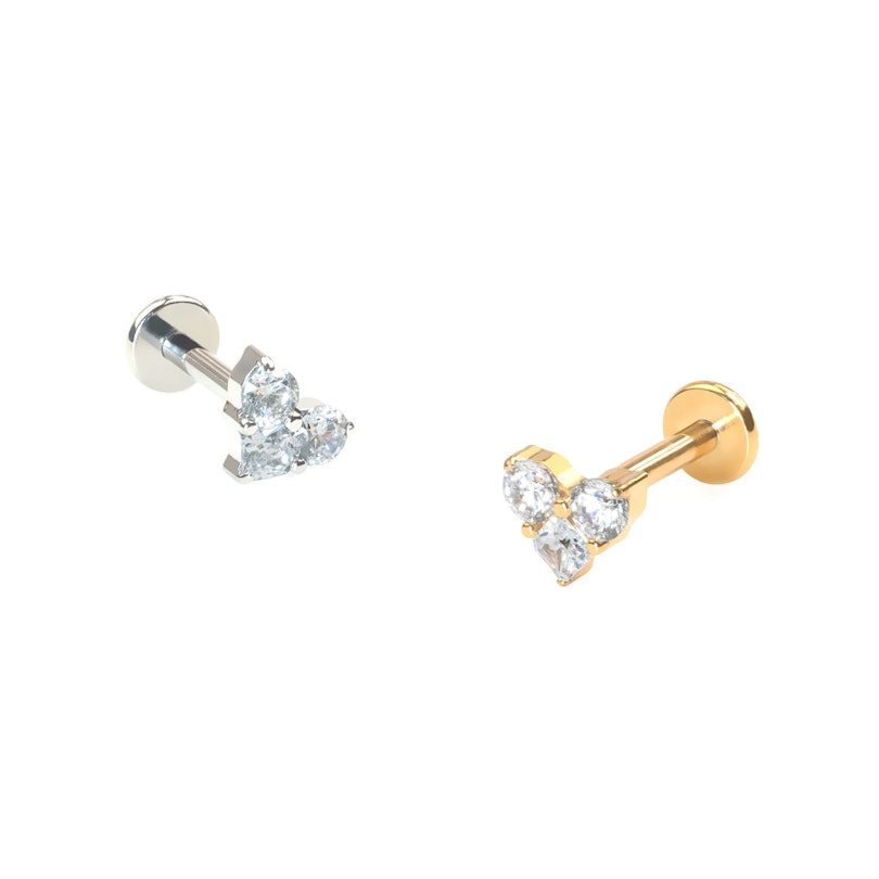 Deze titanium labret heeft 3 CZ steentjes in de vorm van een hartje. De bovenste twee steentjes zijn rond en de onderste is vierkant. Het sieraad heeft een intern schroefdraad en is beschikbaar in een gouden of zilveren afwerking. Dit schattige sieraad zal er goed uitzien in verschillende piercings. Het is 5 mm breed op het wijdste punt. De platte achterkant zorgt ervoor dat het comfortabel draagt.