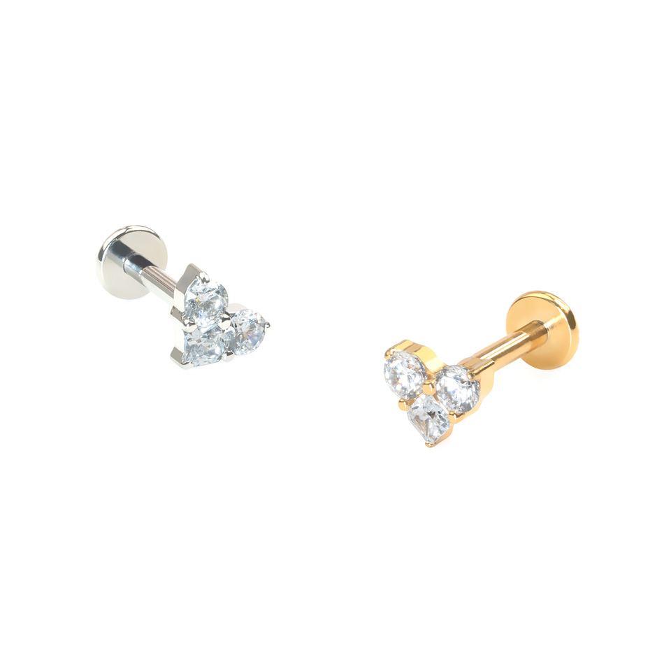 Deze titanium labret heeft 3 CZ steentjes in de vorm van een hartje. De bovenste twee steentjes zijn rond en de onderste is vierkant. Het sieraad heeft een intern schroefdraad en is beschikbaar in een gouden of zilveren afwerking. Dit schattige sieraad zal er goed uitzien in verschillende piercings. Het is 5 mm breed op het wijdste punt. De platte achterkant zorgt ervoor dat het comfortabel draagt.