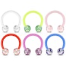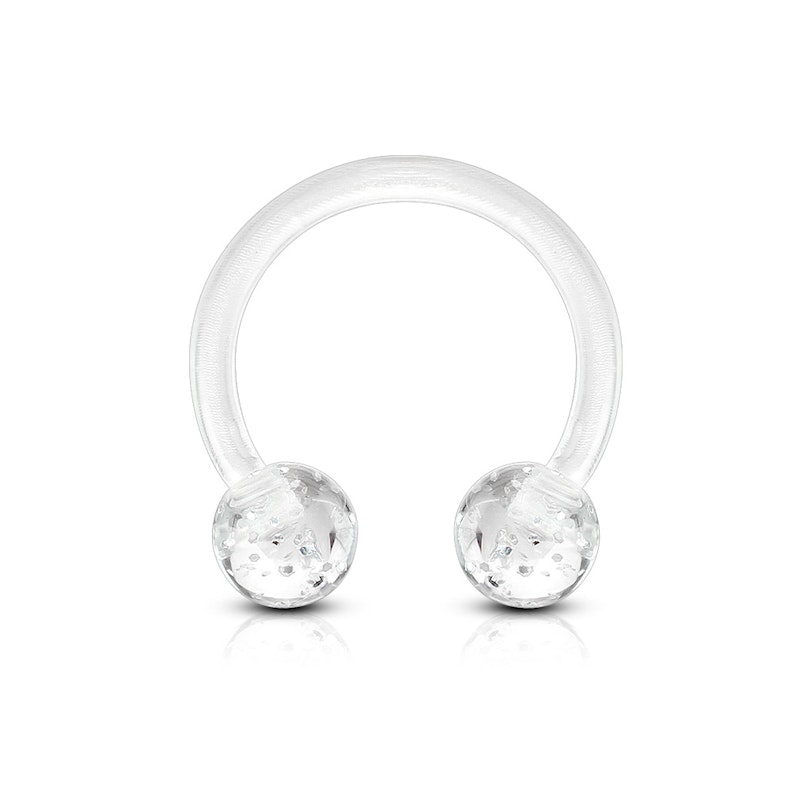 Op de afbeelding hierboven zie je een hoefijzer gemaakt van acryl met balletjes met een geĆÆncorpereerd glitterpatroon. Het hoefijzer is verkrijgbaar in verschillende kleuren, waaronder blauw, groen en roze. De kleur van de hoefijzers zijn niet 100% gelijk aan de kleuren op de balletjes. Als je bijvoorbeeld een blauw hoefijzer kiest, dan is het hoefijzer zelf iets lichter van kleur dan de bijbehorende balletjes. Het hoefijzer is flexibel, wat het inbrengen van het sieraad kan vergemakkelijken doordat het hoefijzer lichtelijk kan buigen wanneer je hem door het piercing gaatje haalt.