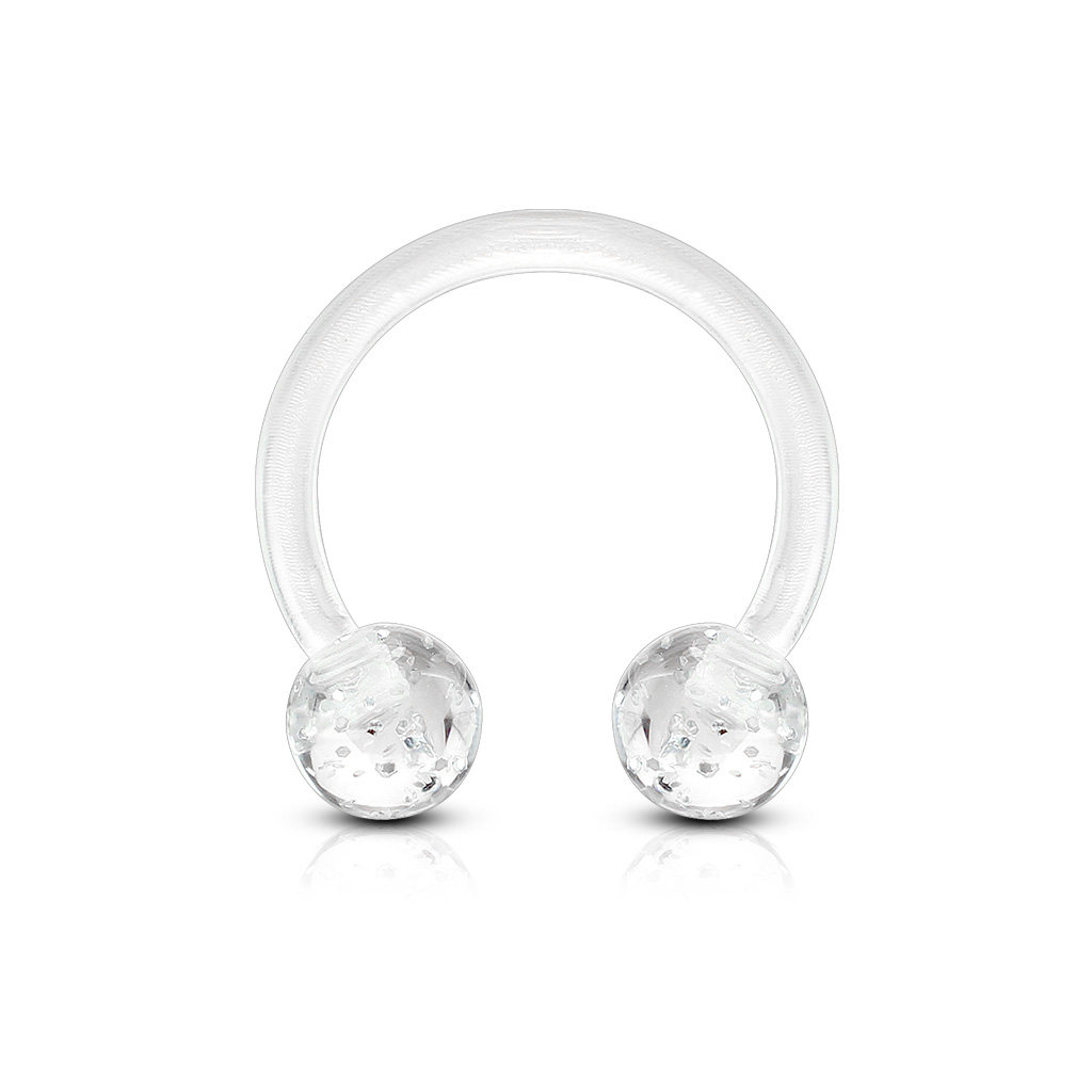 Op de afbeelding hierboven zie je een hoefijzer gemaakt van acryl met balletjes met een geïncorpereerd glitterpatroon. Het hoefijzer is verkrijgbaar in verschillende kleuren, waaronder blauw, groen en roze. De kleur van de hoefijzers zijn niet 100% gelijk aan de kleuren op de balletjes. Als je bijvoorbeeld een blauw hoefijzer kiest, dan is het hoefijzer zelf iets lichter van kleur dan de bijbehorende balletjes. Het hoefijzer is flexibel, wat het inbrengen van het sieraad kan vergemakkelijken doordat het hoefijzer lichtelijk kan buigen wanneer je hem door het piercing gaatje haalt.