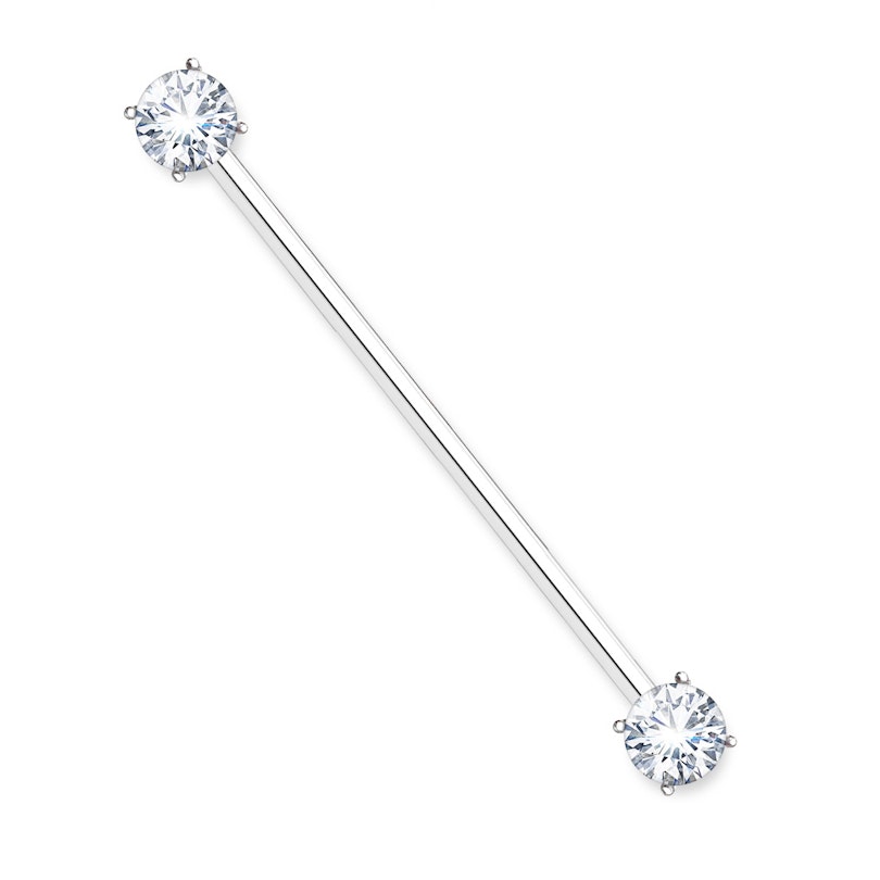 Op de afbeelding hierboven zie je een van de wat meer elegante industrial staafjes. Dit sieraad is gemaakt van chirurgisch staal, en er zitten twee vonkelende transparante steentjes aan ieder uiteinde van het sieraad. De stenen in de sieraden hebben een ronde vorm en zijn ingekapseld in een soort schaaltje, met vier armen die een beetje uitsteken boven de steentjes en de steentjes goed op hun plaats houden. Het hele sieraad heeft 1 kleur.