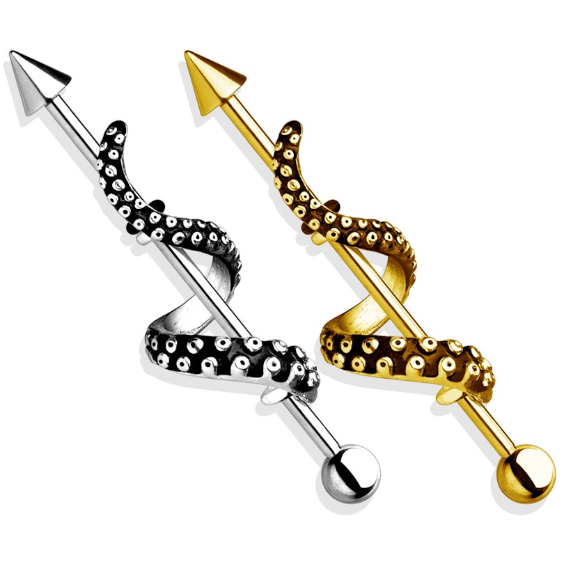 Als je op zoek bent naar iets dat heel bijzonder is voor je industrial piercing, dan ben je nu op de juiste plaats aangekomen. Deze supercoole industrial staaf is gevormd als een pijl en heeft een sluitballetje aan het ene uiteinde en een spike aan het andere uiteinde. Het middelste stuk is echter de blikvanger van het sieraad. Tussen de twee uiteinden bevindt zich namelijk een tentakel, die levensecht op een echte octopustentakel lijkt met zijn kleine zuignapjes.