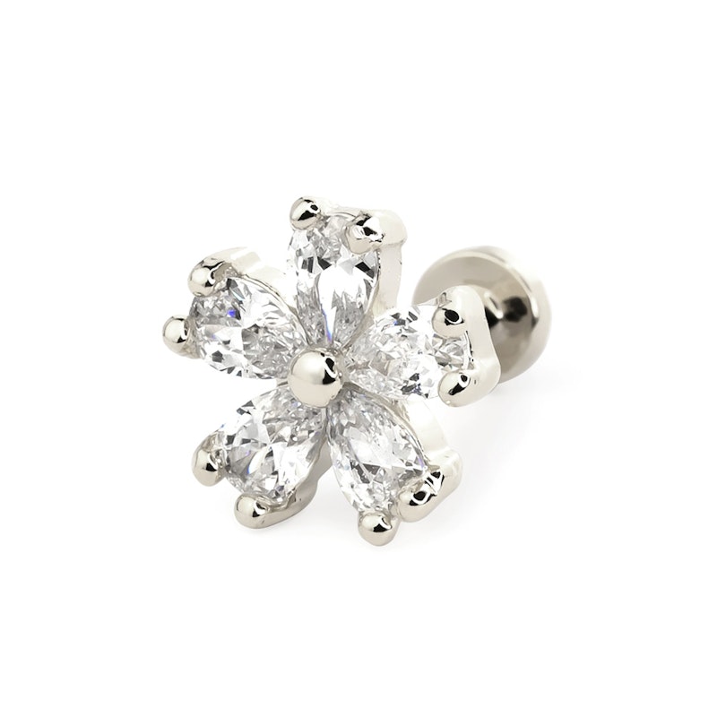 Zoals je uit de naam kan afleiden, is deze labret versierd met een mooie bloem. De bloem krijgt haar vorm door de druppelvormige heldere steentjes die schitteren en fonkelen.