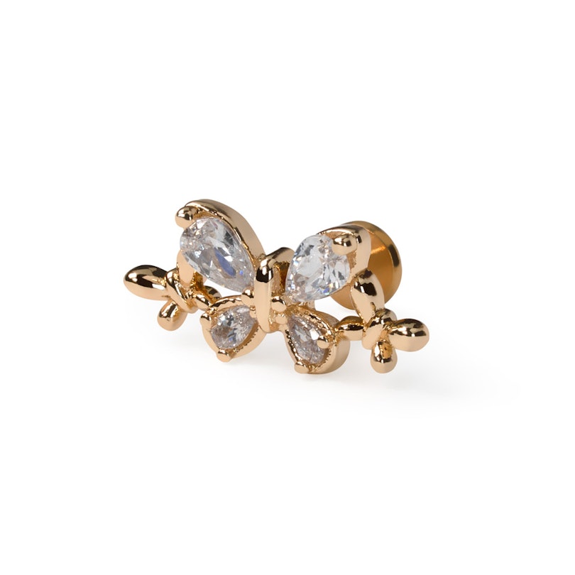 Deze labret met drie vlinders staat in het teken van speels detail. In het midden is een grote vlinder, gemaakt van met tandjes gezette steentjes, terwijl twee kleinere gouden vlinders aan de zijkanten staan, wat een elegant trio vol karakter creeƫrt.