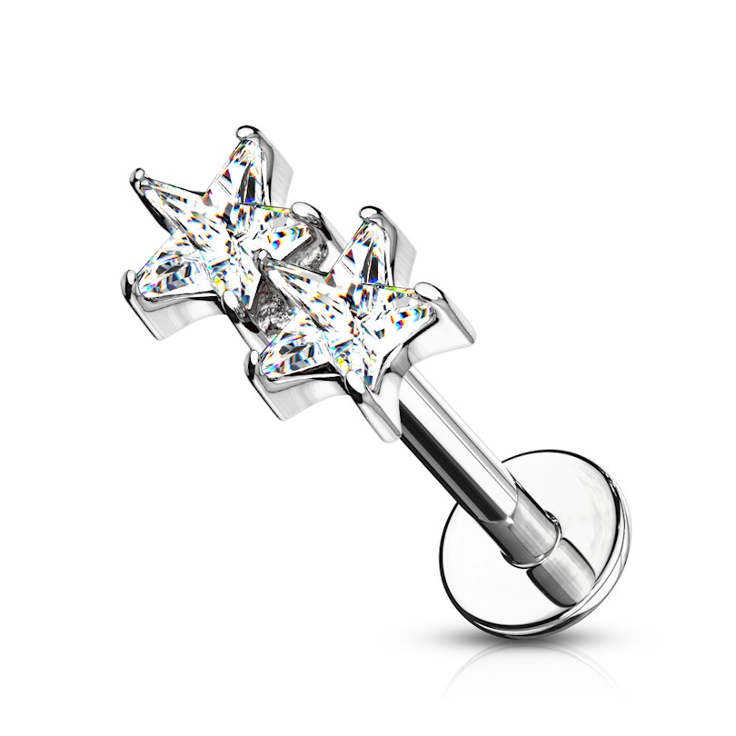 Wat is er beter dan één ster? Twee natuurlijk! En dat is precies wat je krijgt met deze schitterende labret. Voeg dit sieraad toe aan je collectie en iedereen zal onder de indruk zijn van de fonkelende sterren. De labret heeft een interne draad, wat een groot voordeel is bij het inbrengen.
