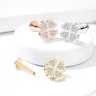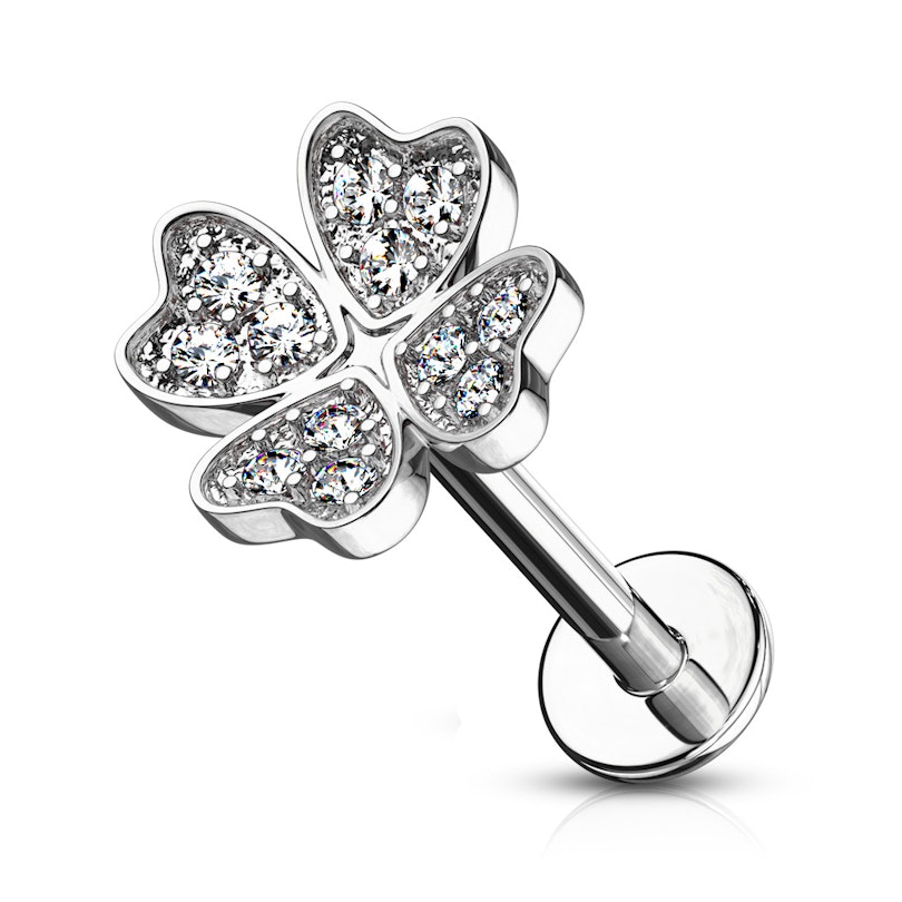 Kan je wel wat geluk gebruiken? Dan kan je het nu kopen! Deze labret is versierd met een prachtig klavertjevier. De klaver is voorzien van mooie fonkelende stenen op elk van de vier blaadjes. Doordat de blaadjes naar de binnenkant toe iets naar onderen buigen, lijkt het bijna een echt klavertjevier. Het klavertje is gemaakt van messing en daarna gecoat, zodat het bij de rest van het labret past.