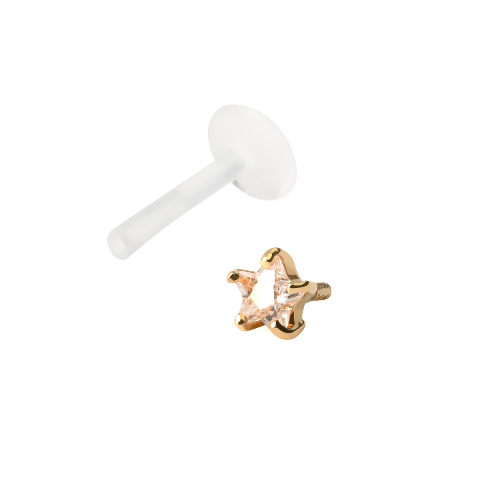 Labret uit 14 karaats goud met een stervormige steen en ptfe staaf