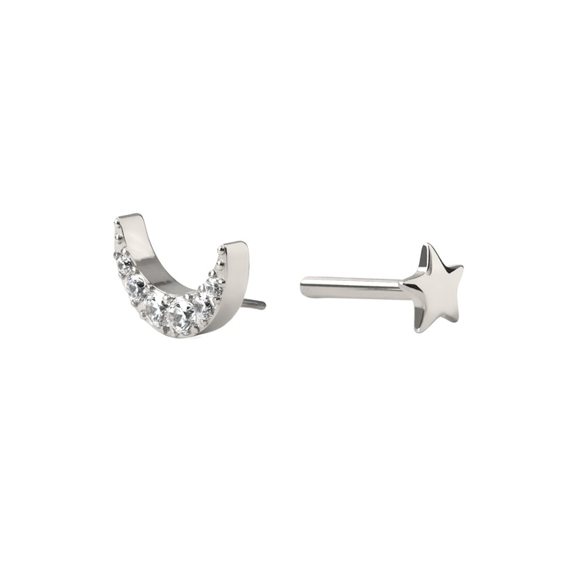 Deze mooie titanium labret heeft een met CZ steentjes gezette maan. De stervormige achterkant maakt deze piercing perfect om te dragen in piercings waar beide kanten van het sieraad zichtbaar zijn.