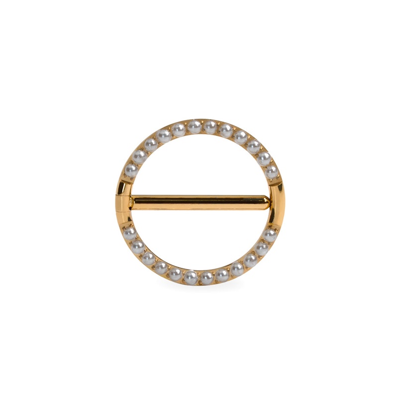 Deze met parels gezette tepel clicker in titanium bewijst dat parels niet alleen voor kettingen zijn. Een volledige cirkel van met tandjes gezette parels in gouden of zilveren afwerkingen omlijst je piercing met wat attitude.