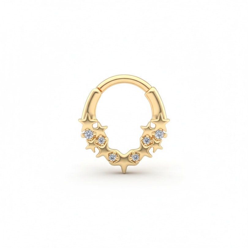 Deze naar voren gerichte ring met sterren en manen zal een prachtige toevoeging zijn aan je collectie. De scharnieropening maakt het makkelijk om de ring in je piercing te doen en vast te zetten.