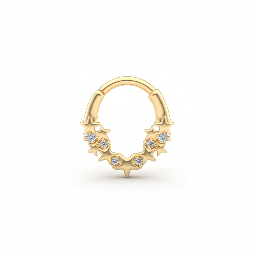 Deze naar voren gerichte ring met sterren en manen zal een prachtige toevoeging zijn aan je collectie. De scharnieropening maakt het makkelijk om de ring in je piercing te doen en vast te zetten.