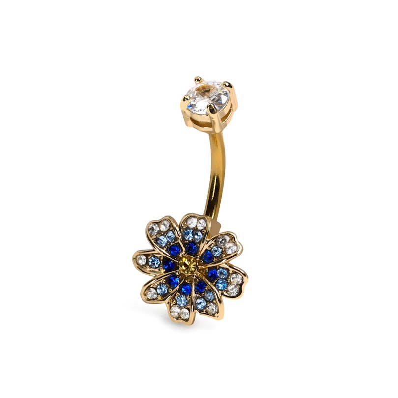 Deze schattige navel barbell is gemaakt voor crop top seizoen. Het sieraad heeft een bloem gemaakt van kleine blauwe steentjes met een centrale gele steen. De bovenste bal heeft een doorzichtige steen.