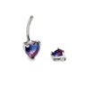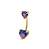 Deze navel barbell met tweekleurige roze en paarse hartjes heeft twee schattige hartjes die er roze en paars uit zien, afhankelijk van het licht en de hoek. Er is een kleiner hartje aan de bovenkant, 6mm gemeten op het wijdste punt, en een grotere aan de onderkant, 7.5 mm gemeten.