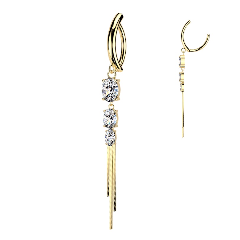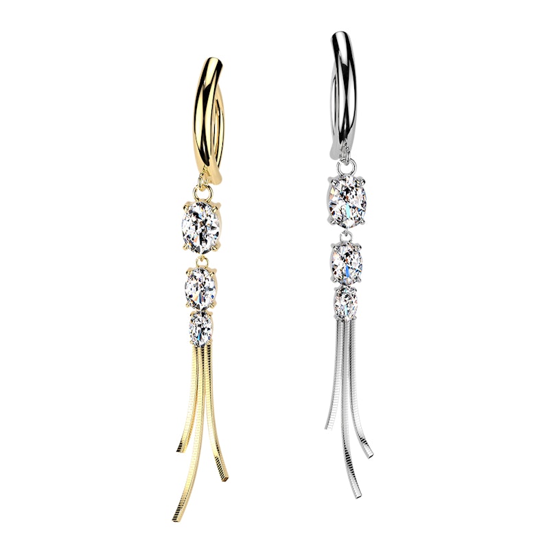 De navel clicker met steentjes en kettinkjes geeft extra detail aan je navelpiercing. De steentjes zitten in het midden in een nette tandzetting, met fijne kettinkjes die eronder hangen voor een wat meer aangeklede look. Verkrijgbaar in goud- en zilverkleur, en het soort sieraad waar je naar grijpt als je iets meer wilt dan een eenvoudig staafje.