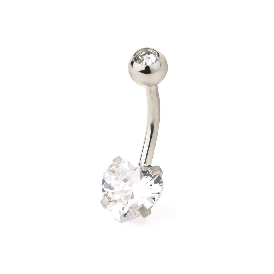 Hartjes zijn onwijs populaire ontwerpen voor piercings, aangezien het een vrouwelijke look geeft, wat goed bij navelpiercings past. Dit hartje heeft de vorm van een uitgesneden steen, zoals je kunt zien op de afbeelding hierboven. Het hartjessteentje aan de onderkant van het sieraad is echter niet de enige steen die te zien is op de navelpiercing. Er zit namelijk ook nog een steen in de top bal van het sieraad, wat een goede match is met het hartjessteentje.