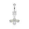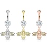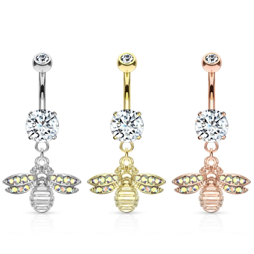 De navelpiercing die je hierboven ziet, heeft een schattige kleine bij die aan de hanger hangt. De bij is gemaakt van messing en heeft op elke vleugel een aantal kleine steentjes gemonteerd die de meeste kleuren van de regenboog bevatten - we noemen het aurora boeralis, omdat het ook kan doen denken aan het noorderlicht. De bij hangt aan een staafje van 10 mm lang en 1.6 mm dik. Het is gemaakt van chirurgisch staal zoals de meeste andere piercings die je hier zult vinden.