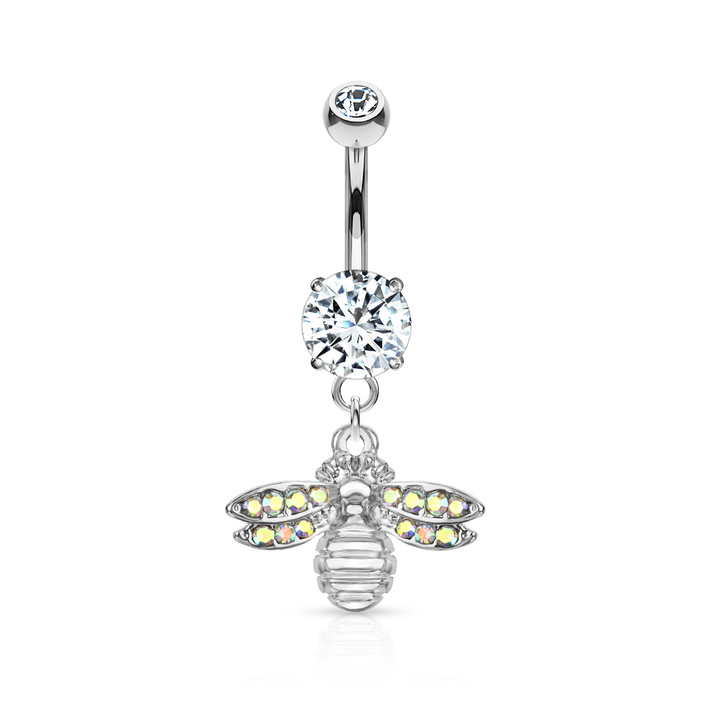 De navelpiercing die je hierboven ziet, heeft een schattige kleine bij die aan de hanger hangt. De bij is gemaakt van messing en heeft op elke vleugel een aantal kleine steentjes gemonteerd die de meeste kleuren van de regenboog bevatten - we noemen het aurora boeralis, omdat het ook kan doen denken aan het noorderlicht. De bij hangt aan een staafje van 10 mm lang en 1.6 mm dik. Het is gemaakt van chirurgisch staal zoals de meeste andere piercings die je hier zult vinden.