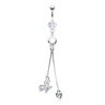 Een werkelijk fijne navelpiercing met lange kettingen en mooie motieven van transparante steentjes. Het hangertje is compleet in zijn ontwerp, beginnend met een kleine ring die gedecoreerd is met een hartje van transparante steentjes. Onder dit hartje zit een ring waar de twee lange ketting aan vast zitten, onafhankelijk van elkaar. De kettingen zitten niet samen en kunnen zicht dus vrij met de bewegingen van jouw lichaam mee bewegen.