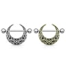 Dit sieraad is voor jou, als je een navelpiercing hebt. Bij voorkeur horizontaal, omdat dit sieraad daar het meest geschikt voor is. Het sieraad bestaat in al zijn eenvoud uit een 22 mm lang staafje van chirurgisch staal. Er is een schild aan het staafje gemonteerd met behulp van twee ringen aan de achterkant van het schild. Het schild heeft de vorm van een halve maan, die aan de bovenkant open is. De halve maan is versierd met kleine eigenzinnige patronen, filigraan genaamd. Het schild is van messing.