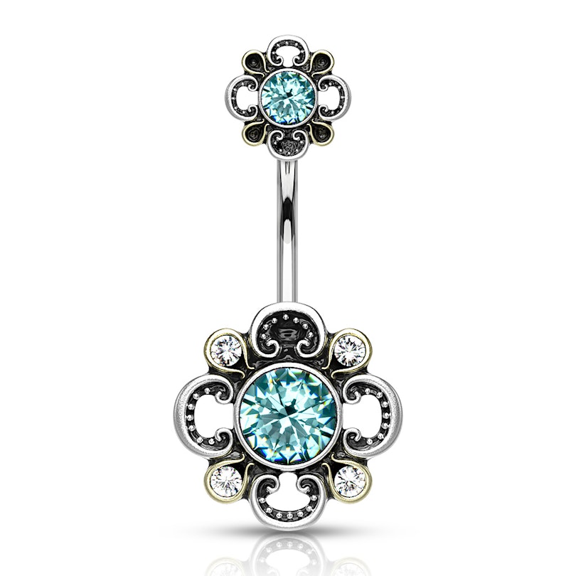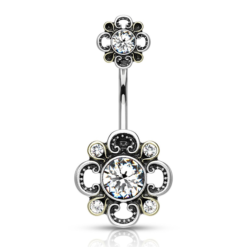 Naam: Navelpiercing met filigranen bloem met gestanste bloemblaadjes en steentjes