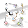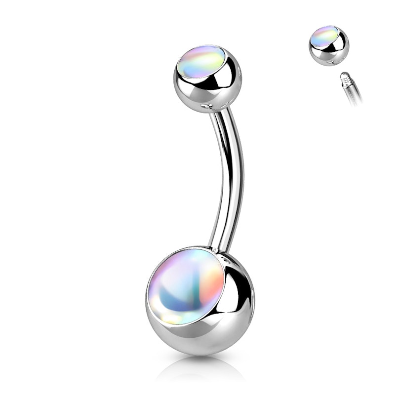 Soms zie je het op zeepbellen of een olievlek... Het is als een regenboog die van kleur verandert wanneer hij beweegt. Datzelfde effect vind je op deze navelpiercing want de twee stenen hebben een regenboogglans. Je kunt het echte effect niet goed op de afbeelding zien aangezien je moet bewegen om het goed te zien. Maar iedereen zal de glans zien als jij voorbij loopt met deze piercing in!