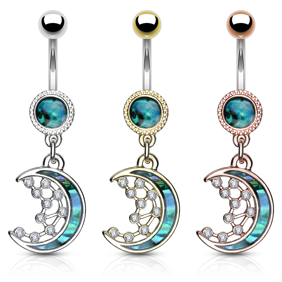 Op de afbeelding hierboven zie je een van de wat meer mystieke navelpiercings. Het sieraad is gevuld met betekenis en symbolen van verschillende geloven uit de hele wereld. Aan het sieraad hangt een halve maan met een aantal sterretjes. Een halve maan draagt bijvoorbeeld de betekenis van groei en creativiteit in de oude Keltische culturen. Parelmoer is een natuurmateriaal, waar namelijk de binnenste laag van een parelmossel uit bestaat - dit materiaal wordt vaak gebruikt voor het creƫren van sieraden.