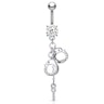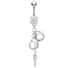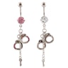 Super coole en enigszins provocerende navelpiercing met een grote steen en handboeien als hanger. Deze kleine handboeien zijn met kleine mooie steentjes op de randen versierd. Je kunt kiezen uit roze of transparante stenen. De kleur die je kiest, komt terug in zowel de grote sluitbal als de handboeien.